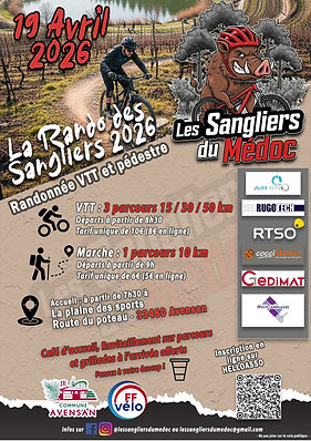 Ce club propose sa 1ère édition de la Rando des Sangliers à Avensan. Ouverture de l'espace accueil à partir de 08h00 à la salle des fêtes d'Avensan. Lors des inscriptions, les participants devront signer le règlement général de la randonnée incluant la charte du randonneur (port du casque obligatoire et autres consignes). Cette manifestation VTT en premier lieu et Marche est ouverte également aux vélos de type "GRAVEL" ainsi que les "VELO A ASSISTANCE ÉLECTRIQUE". Les distances sont 15, 30 et 50km en VTT et 10km en marche.